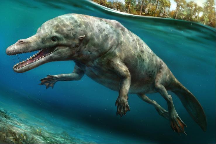 鲸类的祖先是一种生活在陆地上的四足哺乳动物,大约在始新世时期开始逐渐下水。化石证据显示,最早的"原鲸"大约5200万年前生活在今天的巴基斯坦地区,看起来有点像一条长着蹄子的狼。这些动物最初只是在水边活动,可能是为了捕食鱼类或躲避天敌,后来越来越依赖水域生活,身体也逐渐适应水中环境。